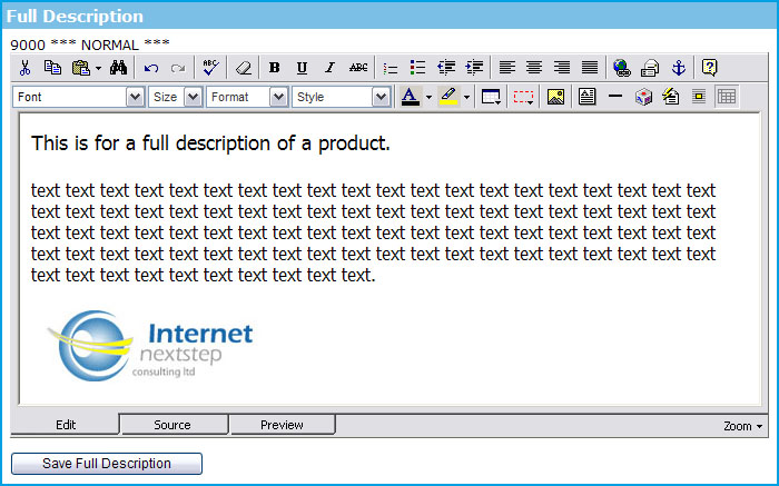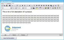 This is where you can fill in a FULL page of information for each product. It is the page that shows from the More Information link in the shopping cart. It will automatically show the ability to add to cart as well as pricing from product configuration. You can hotlink to this page from any other custom page in your system so it is a powerful way to have information stored in 1 place but accessible from many.